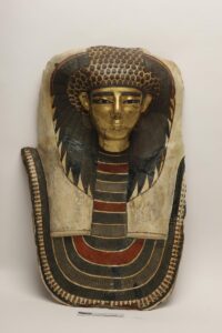 * De foto toont een zeldzaam mummiemasker uit Thebe aan het begin van het Nieuwe Rijk. De vrouw draagt een hoofdtooi van gierenveren.